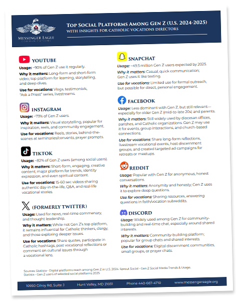 Top Social Platforms Among Gen Z: Insights for Catholic Vocations Directors Let’s Get Started on Your Social Media StrategyGet our free guide to learn which platforms matter most and more importantly, how to start using them effectively.